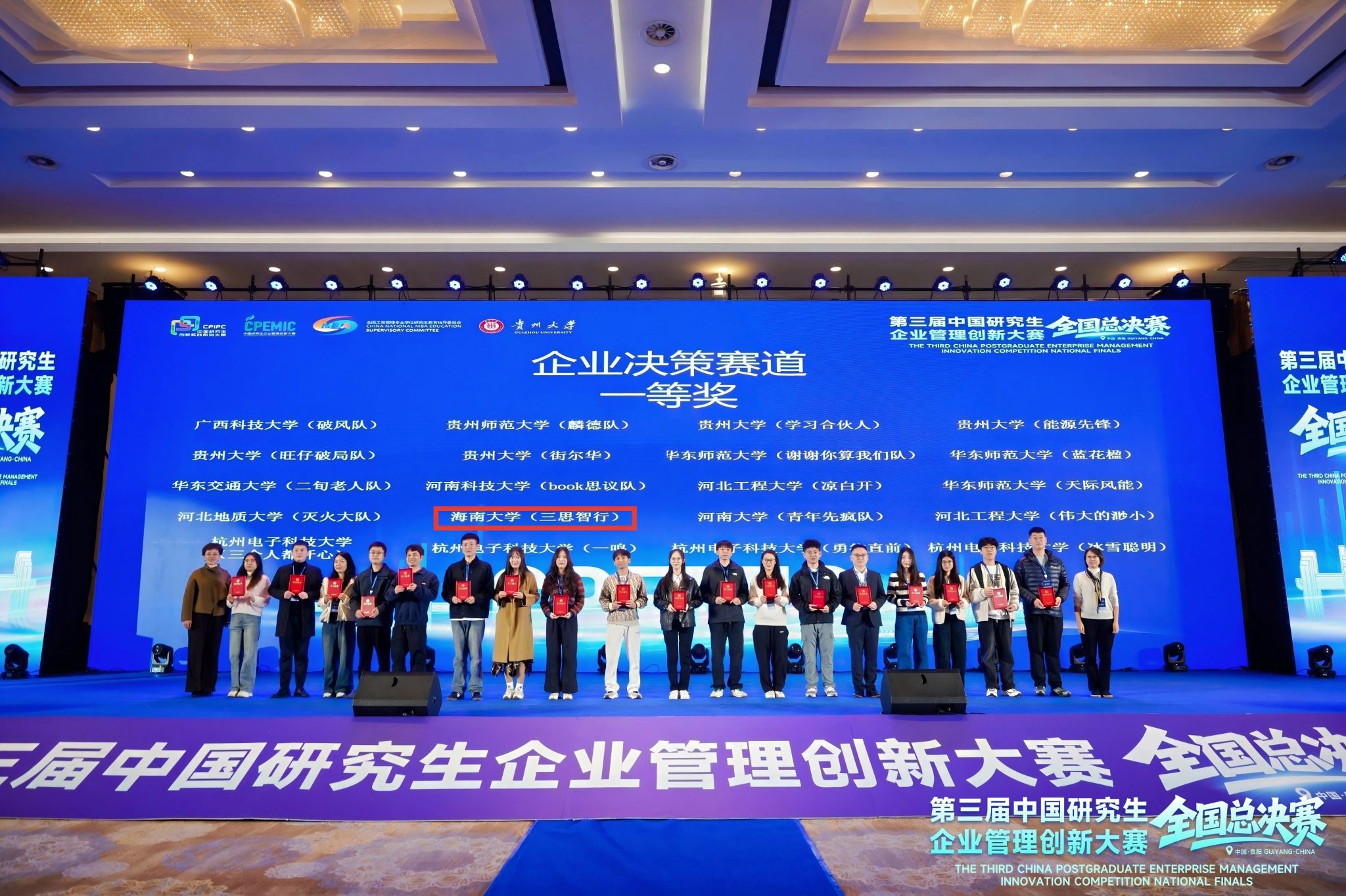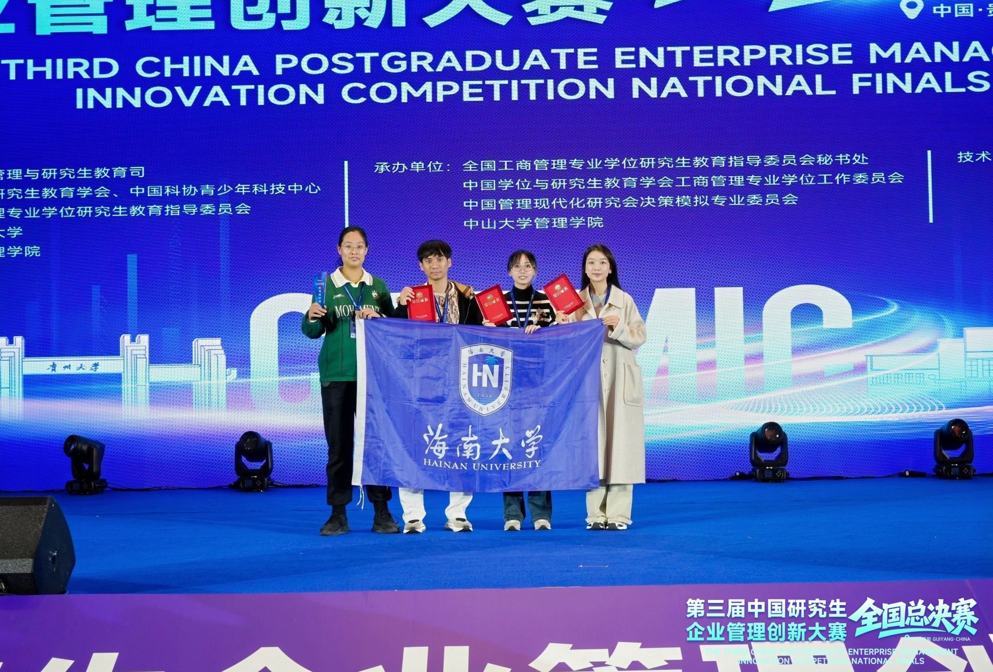 2025年11月8日,第三届中国研究生企业管理创新大赛总决赛于贵州大学顺利结束。海南大学凭借出色的组织能力,荣获优秀组织奖,与北京大学、哈尔滨理工大学、电子科技大学等知名高校共同获此殊荣。海南大学MBA“三思智行队”,成功突围进入总决赛。